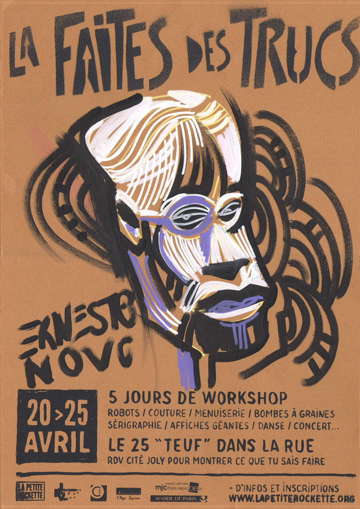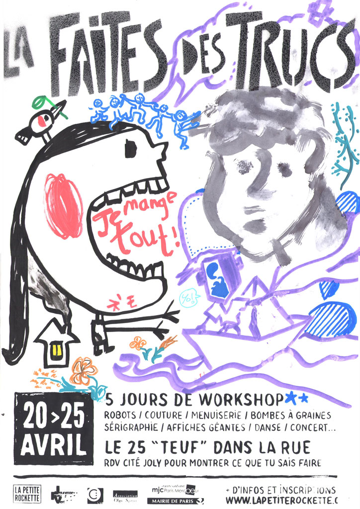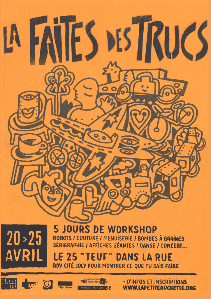 Ateliers de cuisine, danse, création de mobilier à partir de récup, couture, photographie, réparation électronique, robotique absurde, affiches géantes, fabrication de PIF-PAF-POUF, création de jeux de foire… Il y en aura pour tous les goûts. Vous pouvez choisir d’illustrer un ou plusieurs des ateliers proposés ou encore représenter la journée festive de vos rêves dans la rue.