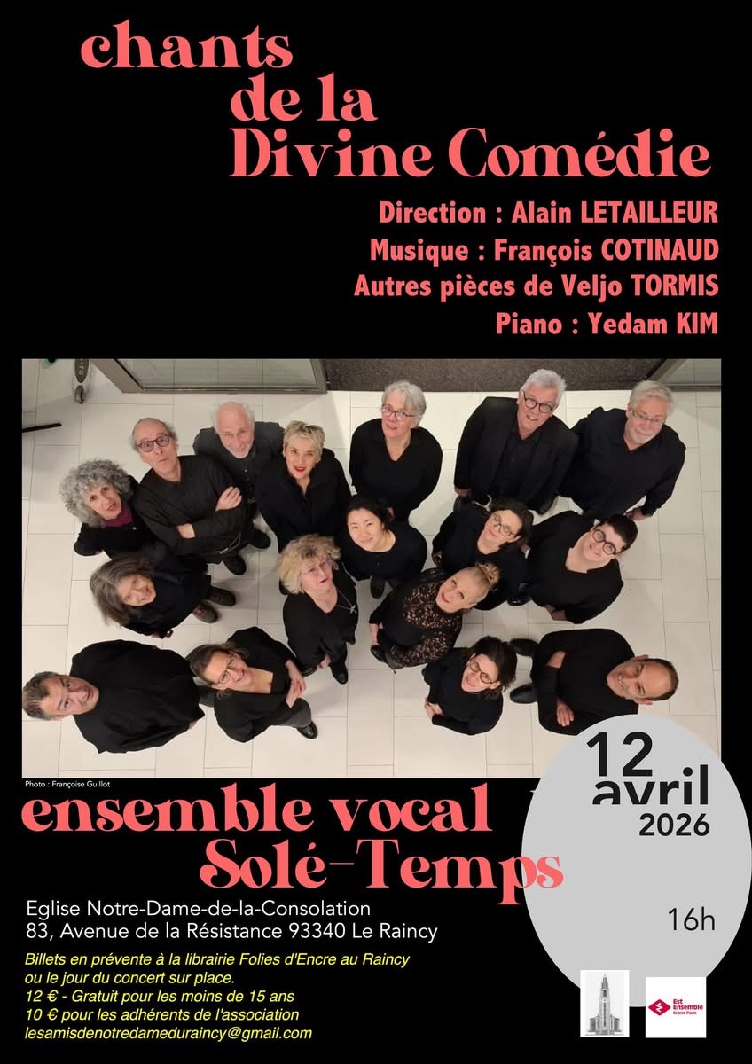 Cotinaud, compositeur issu du jazz, reconnu pour ses pièces puisées à la source du verbe poétique, crée pour quinze choristes un opus endiablé , qui bouscule et célèbre les canti de la Divine Comédie de Dante.