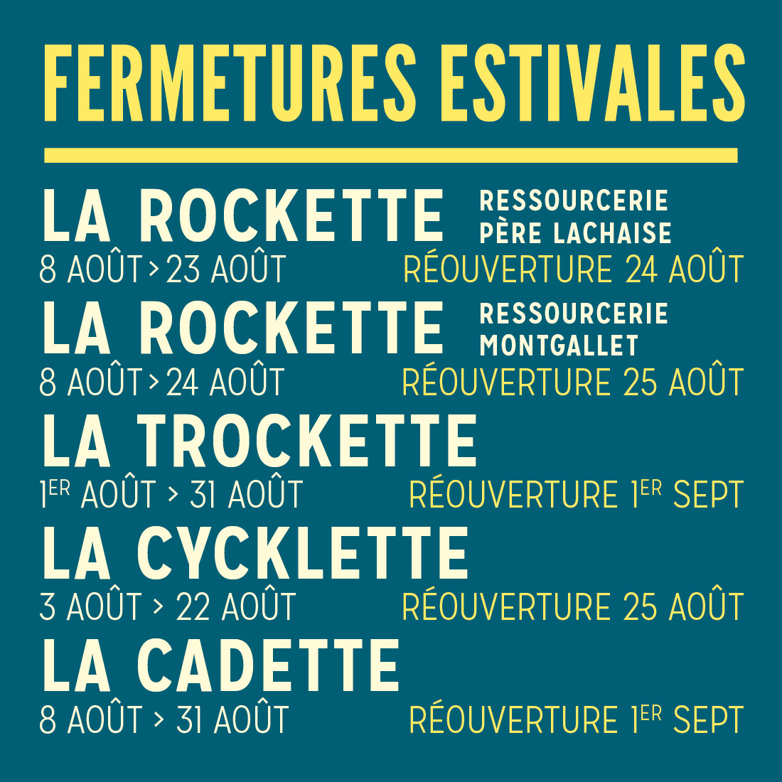 Fermetures Estivales 27 juillet 2021/dans À la une, Cadette, Cycklette, Ressourcerie, Trockette /par La Petite Rockette Calendrier Quand : 1 août 2021 @ 14 h 55 – 29 août 2021 @ 15 h 552021-08-01T14:55:00+02:002021-08-29T15:55:00+02:00 À la une Cadette Cycklette Ressourcerie Trockette