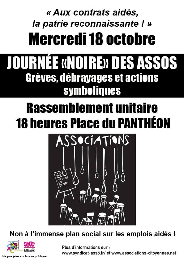 Des centaines d’associations appellent à une grande mobilisation pour réclamer le maintien des contrats aidés dont la suppression représente un « plan social » aussi irréfléchi qu’inacceptable. La suppression des contrats aidés est un immense plan social qui menacent plus de 250 000 emplois en France, tant au sein des collectivités territoriales que dans le tissu associatif français. Cette décision du gouvernement a été prise sans aucune concertation, dans une approche purement comptable du ministère des Finances, et sans tenir compte du caractère catastrophique pour des dizaines de milliers de salarié.e.s qui seront prochainement privés d’emploi. De même, nombre de collectivités territoriales risquent d’être incapables d’assurer la continuité du service public sans les agents qui bénéficiaient de contrats aidés. Enfin, les plus affectés seront nos concitoyens, au premier lieu desquels les plus vulnérables, qui bénéficient des services ou activités offerts par les associations. Le Collectif des associations citoyennes et ses partenaires ont donc décidé de se mobiliser dans toute la France afin de demander en urgence un moratoire sur la suppression des contrats aidés. Le mercredi 18 octobre a été décrété « Journée noire des associations » avec des actions diversifiées qui seront organisées un peu partout en France, dont un enterrement en « grande pompe » au Panthéon à Paris sous le mot d’ordre « Aux contrats-aidés, la Patrie reconnaissante ». A ce jour, l’appel à mobilisation a recueilli la signature de 650 organisations et fédérations d’associations qui représentent plusieurs dizaines de milliers d’associations. Les associations lancent également une action d’interpellation des député.e.s pour les convaincre de peser de tout leur poids sur la loi de Finance 2018 qui doit entériner ou non la décision gouvernementale d’ici à la fin novembre. Le Collectif des associations citoyennes et ses partenaires ont également recueilli des centaines de témoignages de personnes qui seront affectées par cette décision, dont beaucoup de seniors qui avaient trouvé dans ces emplois une opportunité de se réinsérer socialement : « A 57 ans, mon contrat ne sera pas renouvelé à cause de la suppression des Contrats Unique d’Insertion. Je trouve lamentable qu’à quelques années de la retraite, on nous supprime la chance d’avoir un emploi » témoignage ainsi Bernard R salarié à la MJC Jacou. Pour Didier Minot, fondateur du Collectif des associations : « La survie et le dynamisme du tissu associatif est aujourd’hui en jeu ! Tous ces acteurs jouent au quotidien un rôle d’utilité publique crucial pour la cohésion sociale, la solidarité et la vie culturelle de notre pays. L’urgence est de décrété un moratoire et de rétablir les contrats aidés. Il faudra ensuite ouvrir une concertation pour mieux financer les associations et repenser l’emploi dans ces structures qui œuvrent pour l’intérêt général dans un esprit désintéressé. »