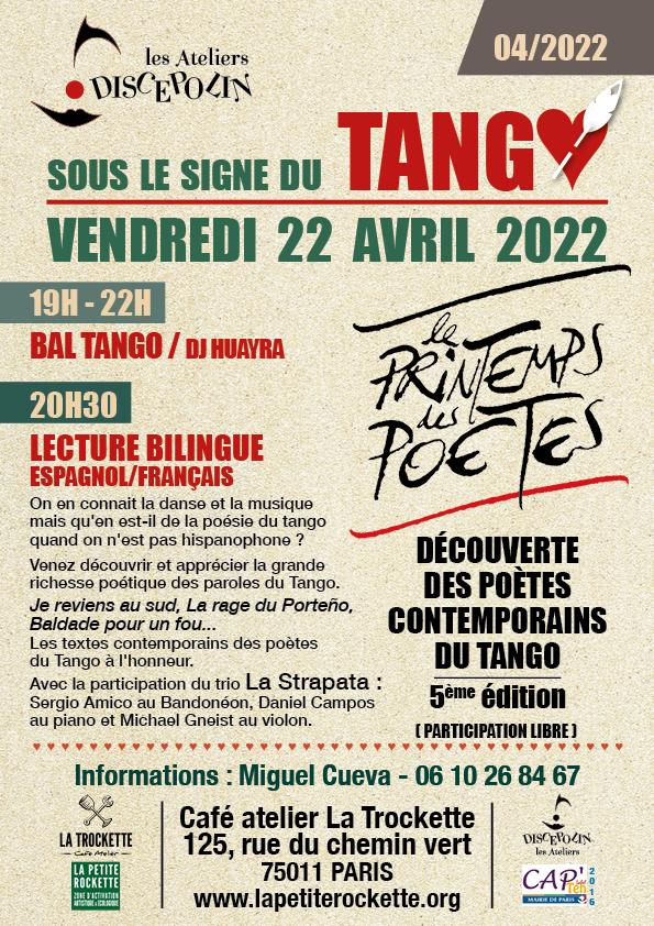 Printemps des poètes du tango 28 mars 2022/dans À la une, activité sportive, Trockette /par La Petite Rockette Calendrier Quand : 22 avril 2022 @ 19 h 00 – 22 h 002022-04-22T19:00:00+02:002022-04-22T22:00:00+02:00 À la une activité sportive Trockette