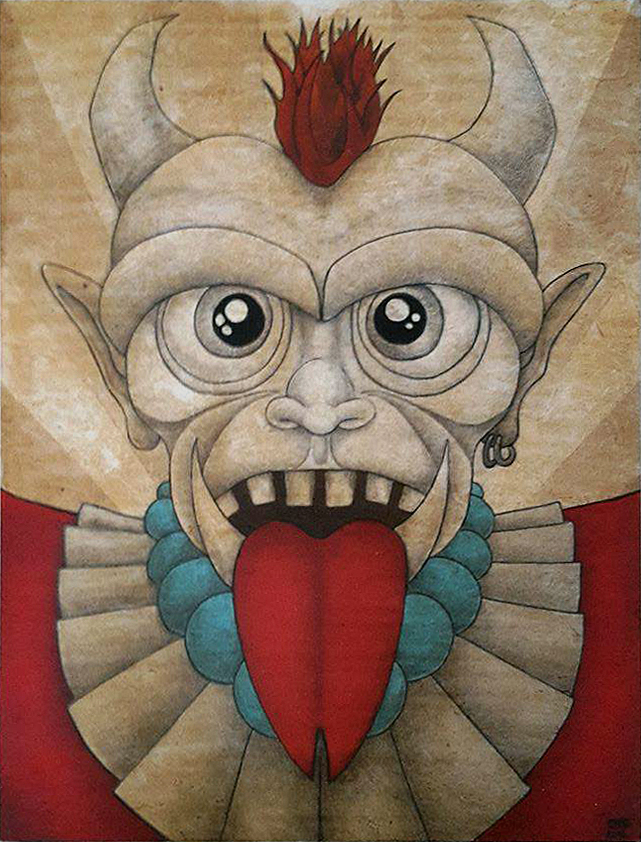 L’Univers de Dadane oscille entre l’enfantin et le sordide. Fait de monstres souriants, il s’en dégage une atmosphère inquiétante… Chanteur de Jabul Gorba, on a déjà pu voir son travail sur les visuels du groupe. Habitué à travailler sur ordi, c’est la première fois qu’il s’essaye à peindre sur des planches avec de l’acrylique et des crayons…