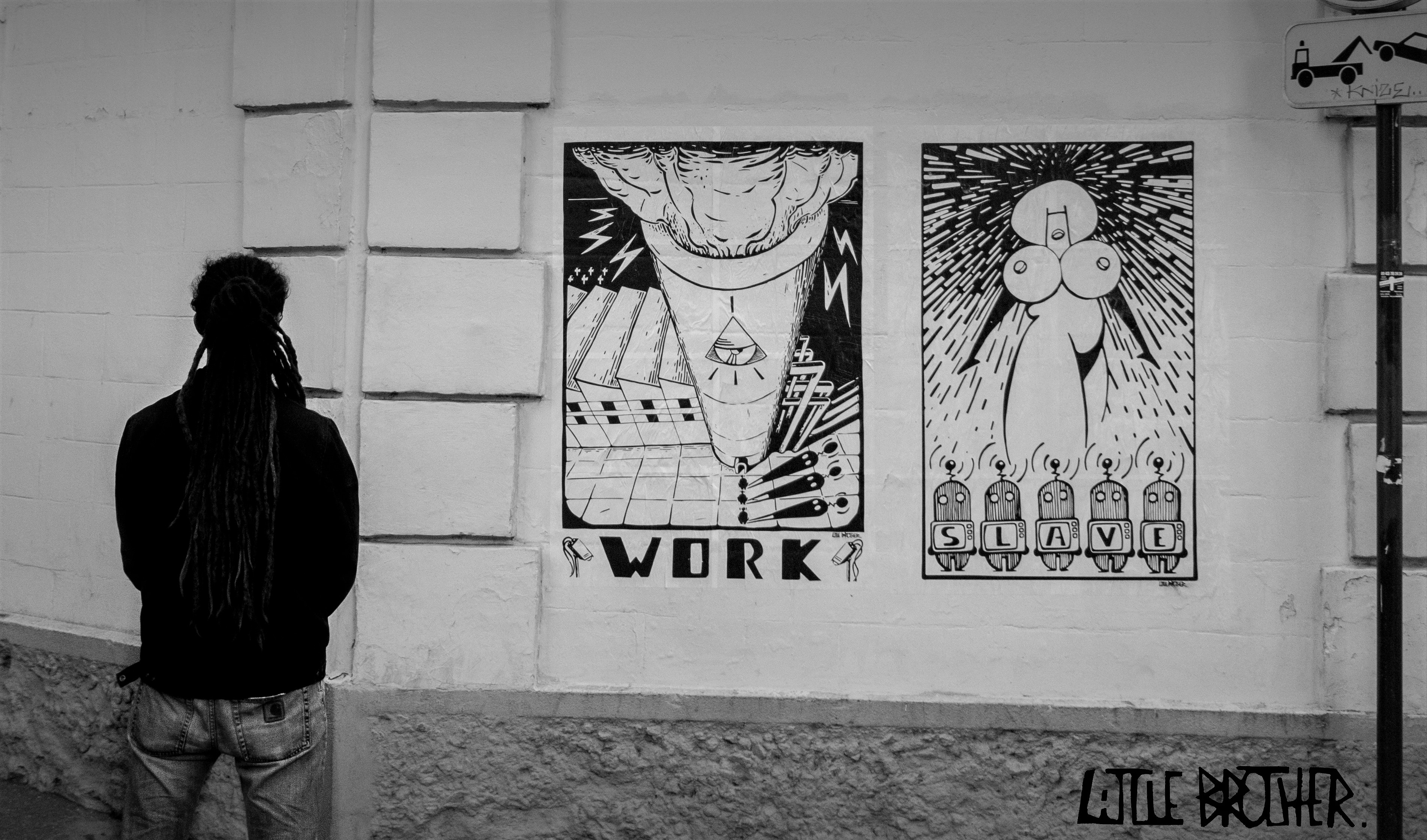 Street Artist basé à Paris, Little Brother nous fait découvrir petit à petit, une suite d’images faisant partie d’un grand discours mystérieux. Chaque œuvre, à l’image de l’individu, peut se combiner avec d’autres et créer des petites cellules de révolte immédiate pendant que le tableau complet apparait doucement dans la rue. Son style incisif, rempli de symbolisme, est marqué par un fort contraste noir et blanc qui provient de la linogravure, technique de gravure avec laquelle il a débuté et qu’il affectionne particulièrement pour exprimer sa critique d’une société contrôlée, verticale et hyperconnectée dans un univers post-Orwellien.