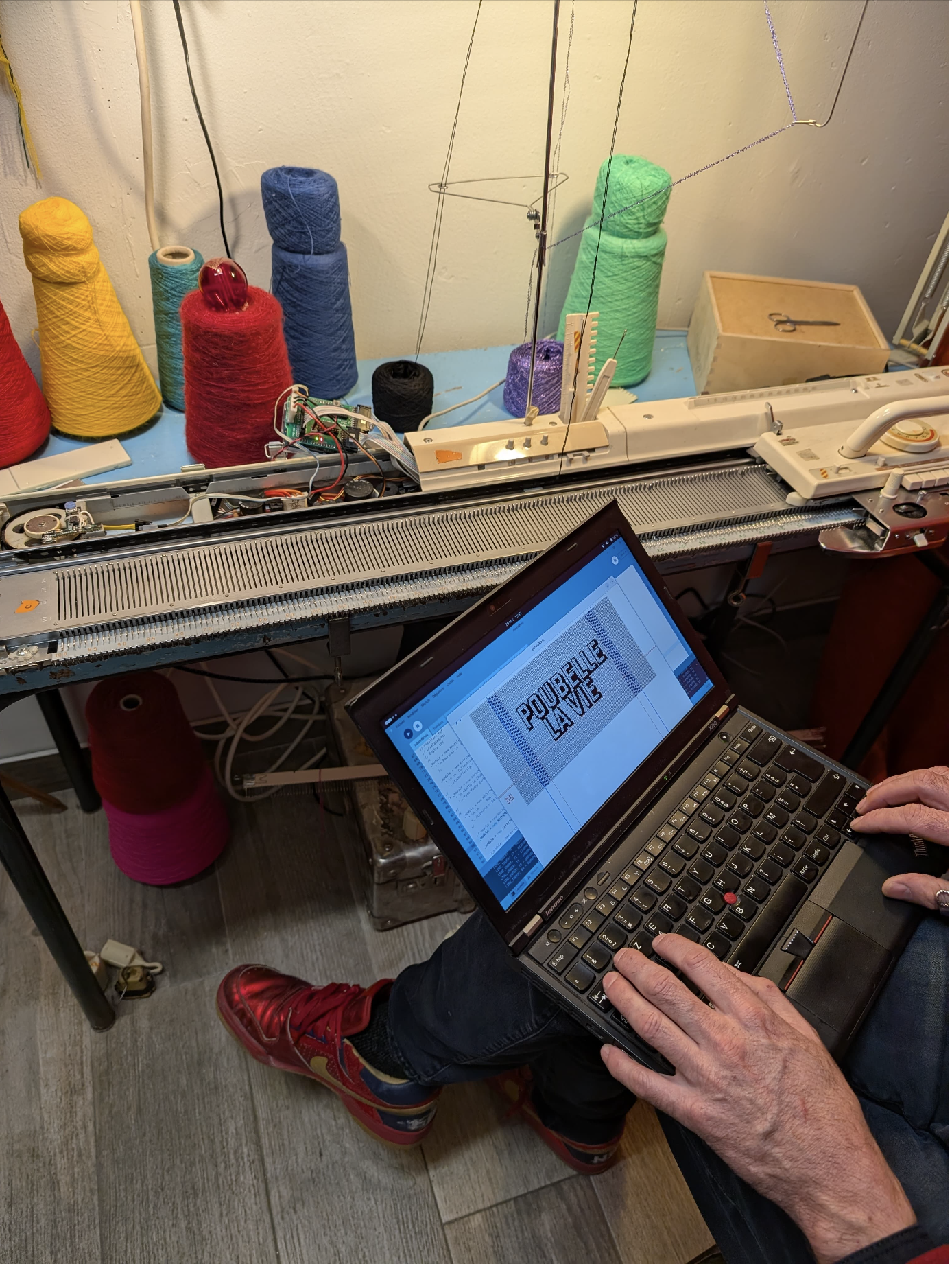 Dans le cadre de leur exposition, les artistes Pauline Vierne et Maurin Donneaud t’invitent à participer à la fabrication de slogans féministes à l’aide d’une tricoteuse hackée.