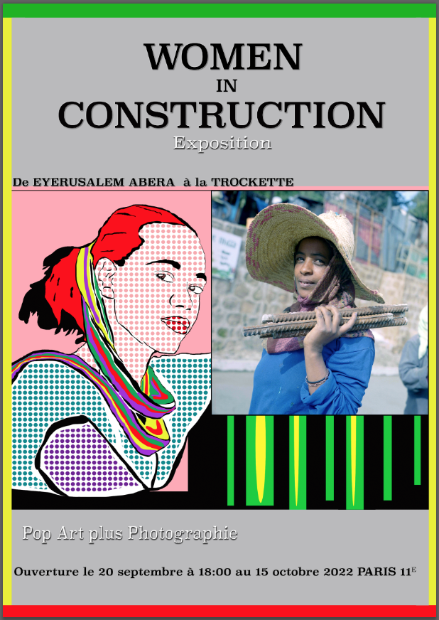 L’exposition s’intéresse à la vie et aux réalités quotidiennes de ces femmes travailleuses dans les métiers de la construction, qui participent avec force et énergie au développement économique de leur pays d’Ethiopie. Être une femme en construction. C’est porter des sacs remplis de sable, de pierres, de ciment, de bidons d’eau en plastique de 20 litres, des tessons de bois de 3 mètres et de blocs de béton, toute la journée, pour un petit salaire quotidien. Ces femmes sont mères, épouses, étudiantes, âgées de 18 à 55 ans. Elles sont fortes. Elles veulent survivre, être libres et indépendantes. Les femmes dans le secteur de la construction ne sont pas uniquement ouvrières. Certaines d’entre elles sont architectes, directrices de grands projets et agissent en véritables capitaines d’industrie. Je souhaite montrer par la photographie « documentaire » et par la création artistique que permet le Pop Art la force et la beauté de ces femmes qui exercent un travail extrêmement pénible, afin de partager mon désir de mieux les connaître. En tant que photographe, j’essaie de capter toutes ces nuances au travers de mon objectif, pour finalement faire acte de création d’une icône populaire. Par le Pop Art, ces femmes deviennent des icônes, symboles de la force, de la volonté, du courage et de la féminité. Une série de femmes, d’âges variés, toutes simples ouvrières, a accepté de participer. En offrant leurs témoignages et en permettant d’être photographiées, autant sur leur lieu de travail que dans leur vie privée, elles m’ont permis de réaliser ce projet.